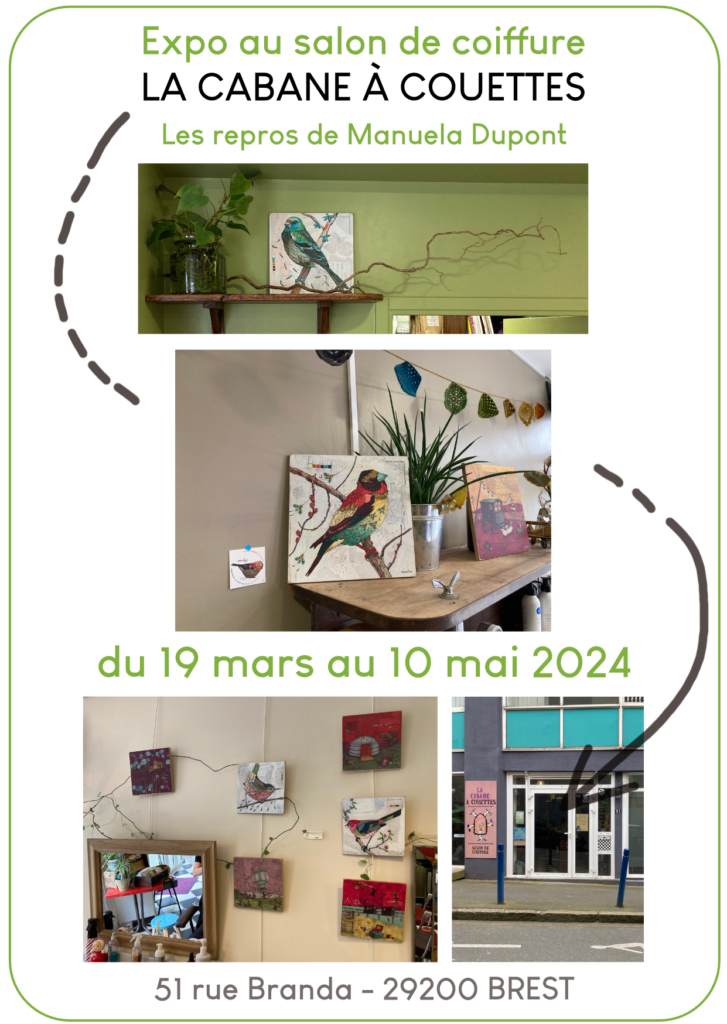 Le temps d’une coupe de cheveux ou d’une couleur naturelle, vous pourrez rêvasser en compagnie de mes repros d’oiseaux (Les Rêveurs) ainsi que les Maisons d’Errance (cabanes, caravane, camion …). Et dans une valisette en bois, quelques cartes postales sont également en ventes.