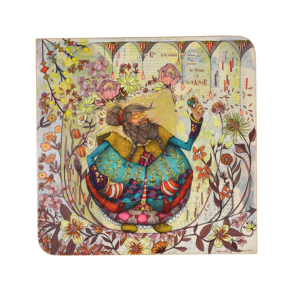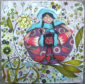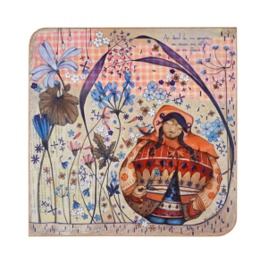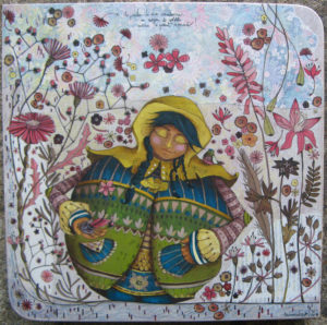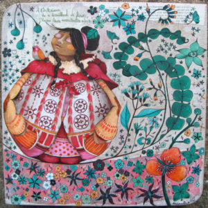 Technique : acrylique et crayons de couleurs sur collage papiers sur bois.