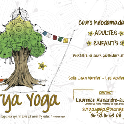 Flyer pour Surya Yoga – Format 10x14,8cm. Dessin de l'arbre et motifs au cr...